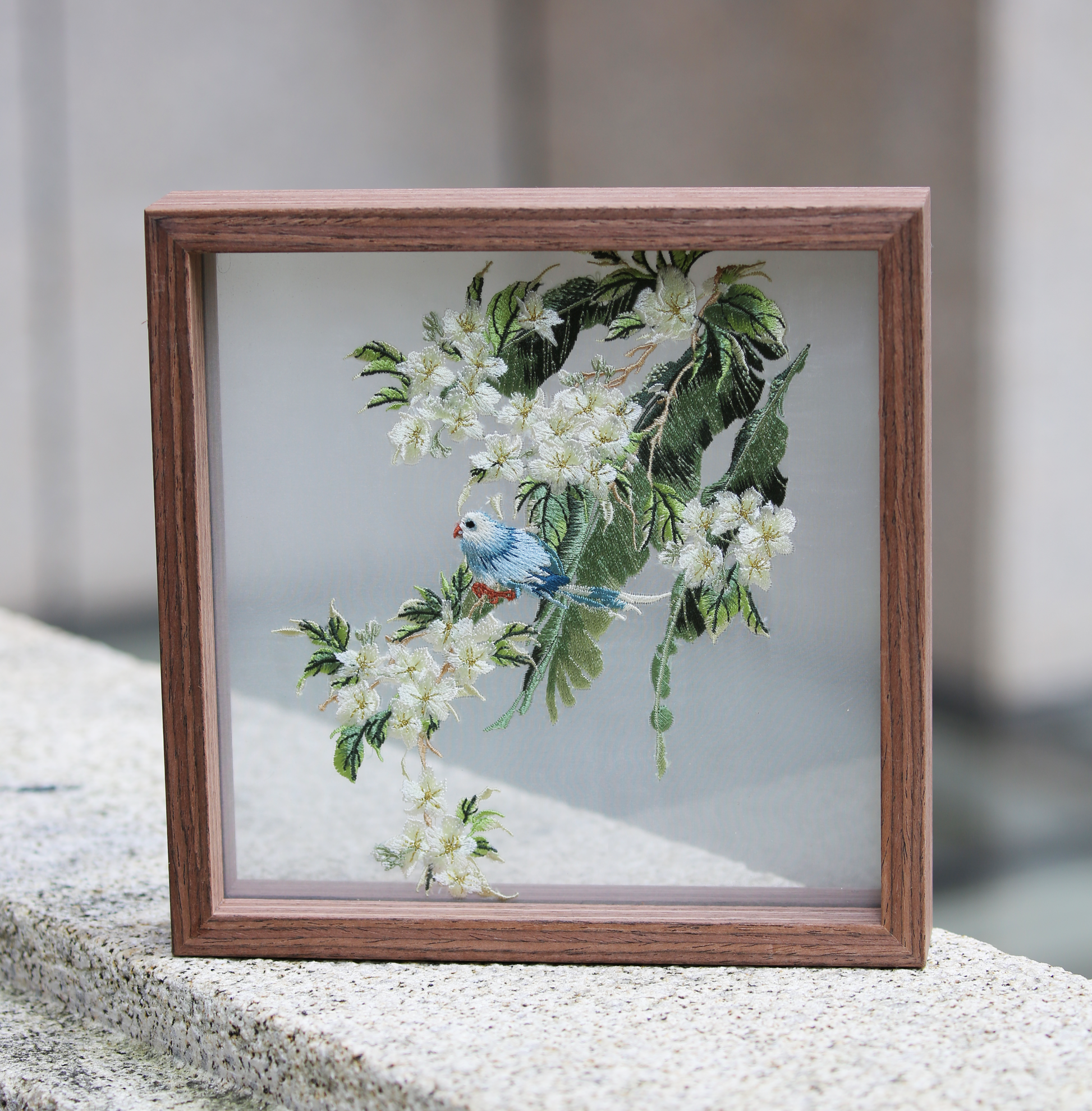 This pattern is embroidered on translucent tulle, and then mounted on glass by hand by the master. It is sandwiched between two pieces of glass. This can prevent the embroidery area from being dusty over time and can also protect the embroidery picture well.