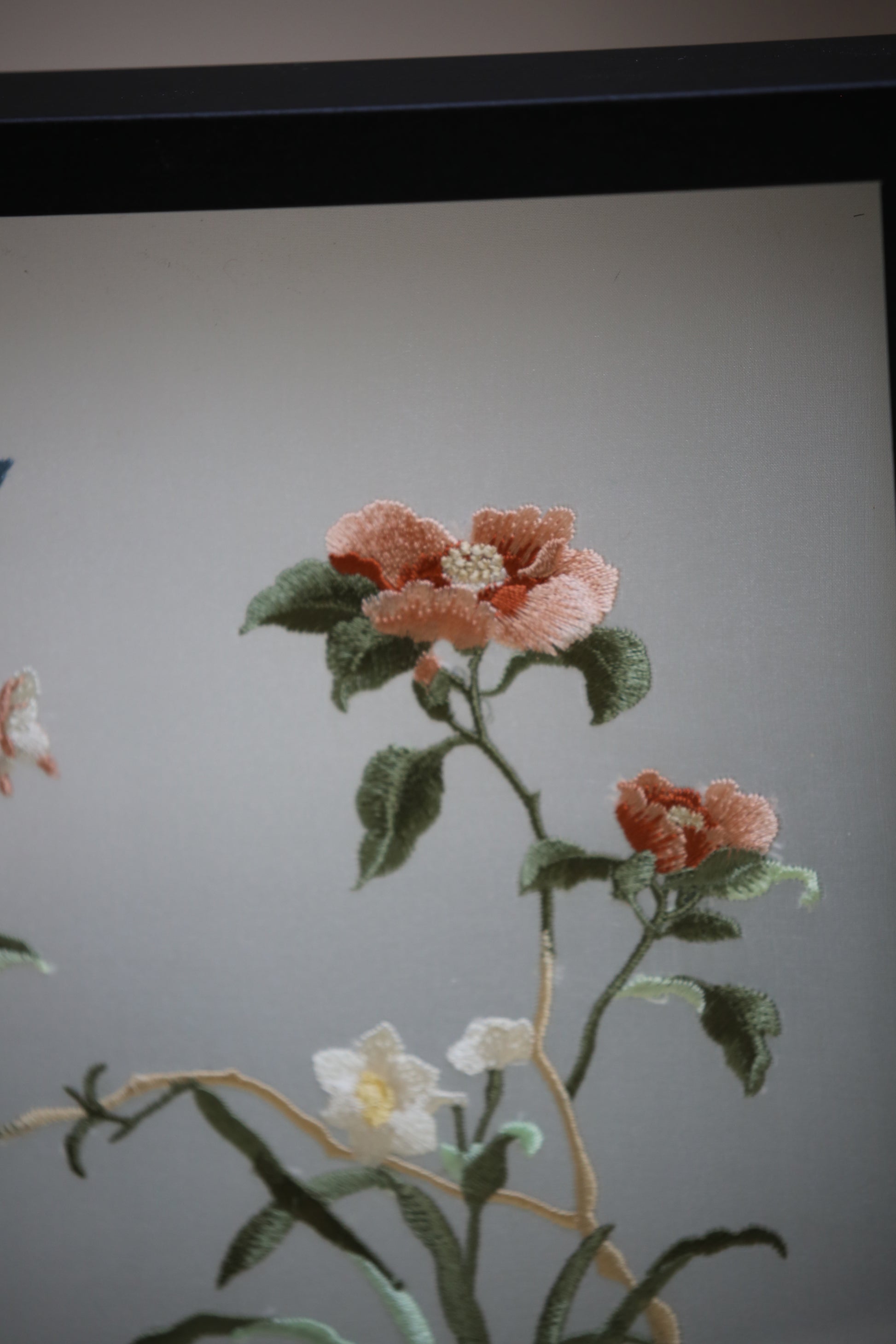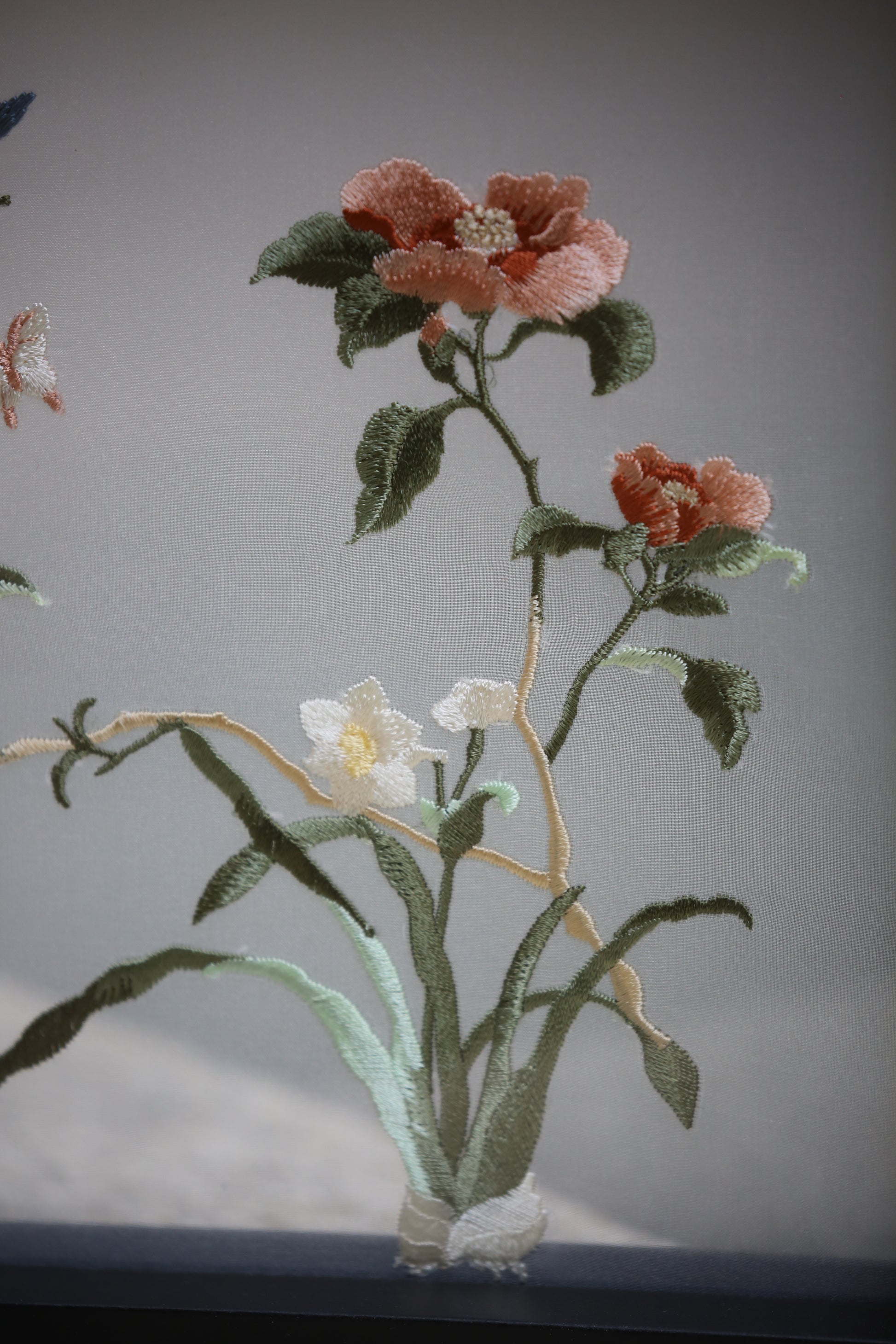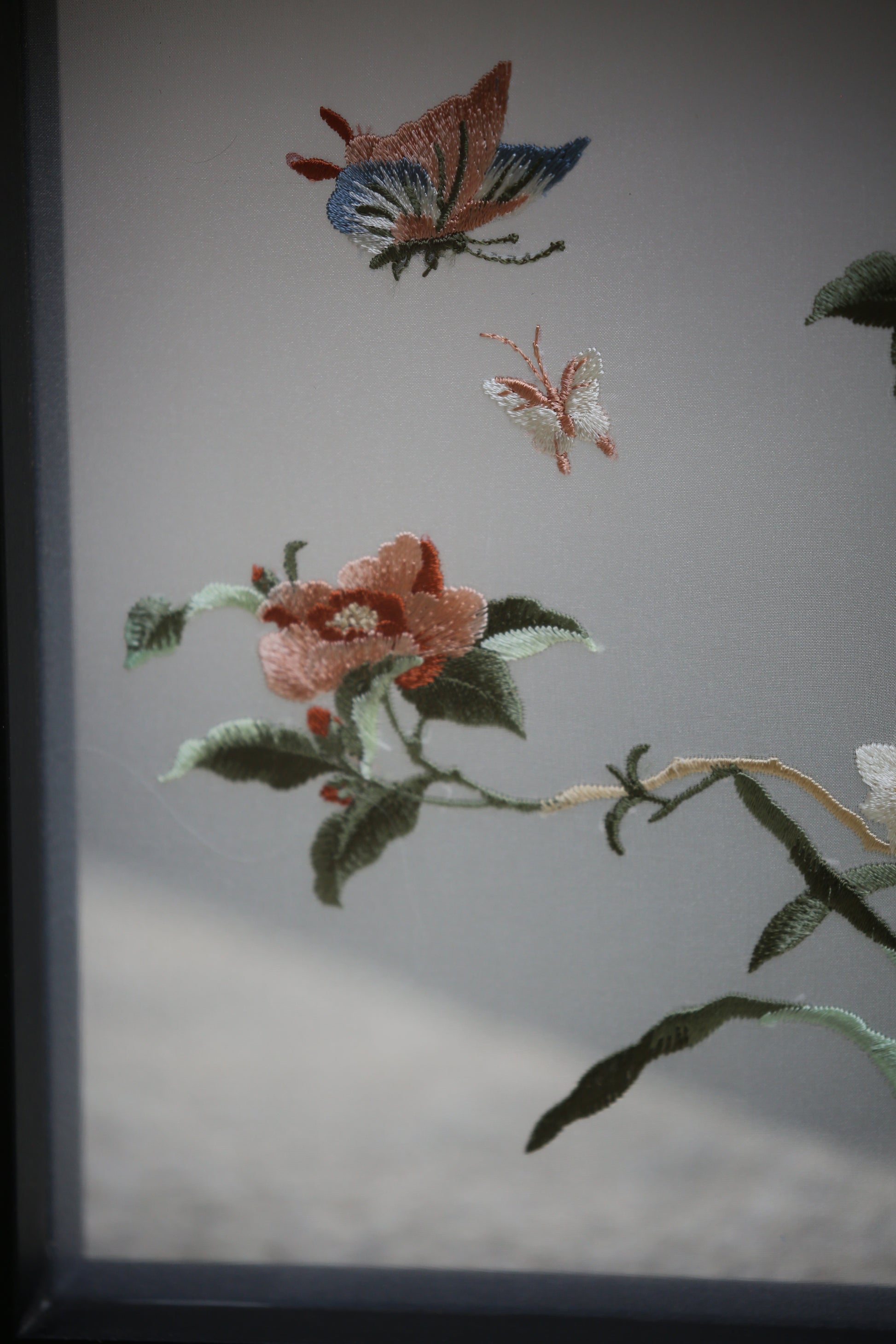 This pattern is embroidered on translucent tulle, and then mounted on glass by hand by the master. It is sandwiched between two pieces of glass. This can prevent the embroidery area from being dusty over time and can also protect the embroidery picture well.